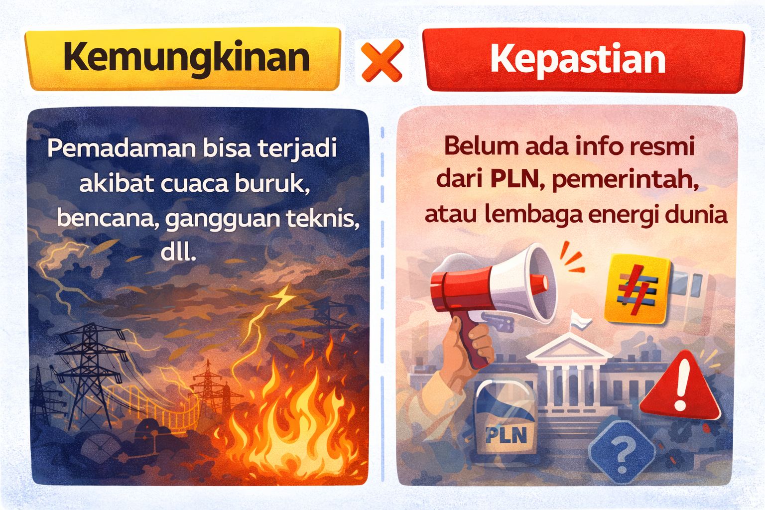 Pemadaman listrik bukan sesuatu yang mustahil. Di berbagai daerah dan negara, gangguan listrik memang bisa terjadi akibat cuaca ekstrem, gangguan teknis, atau bencana alam. Namun, yang perlu dibedakan dengan jelas adalah kemungkinan dan kepastian.